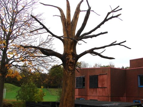 "Trold" af Jørn Hansen. Udført på bestilling af Hyldespjældet. Udført i 2013 af et Kastanjetræ, der skulle fældes