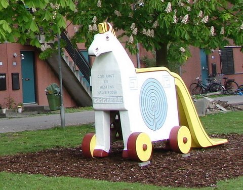 Den trojanske hest af Gunnar Westman er sammen med Vædderbrønden anskaffet i 1976 i forbindelse med byggeriet af Hyldespjældet